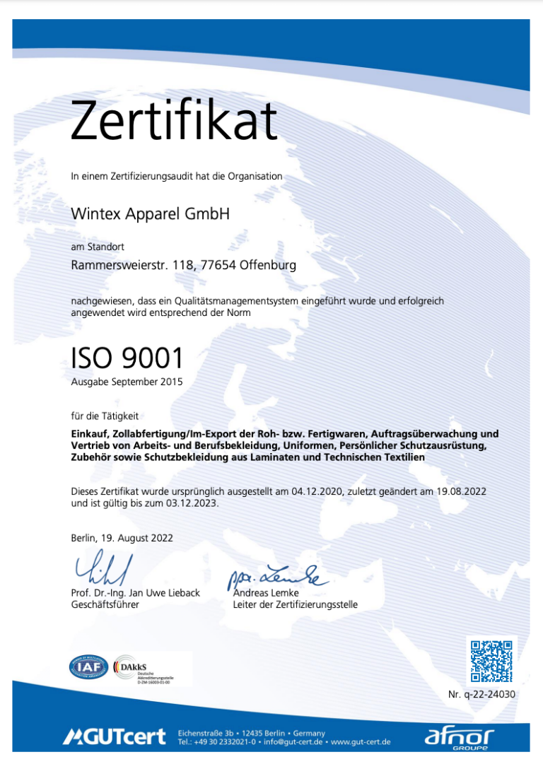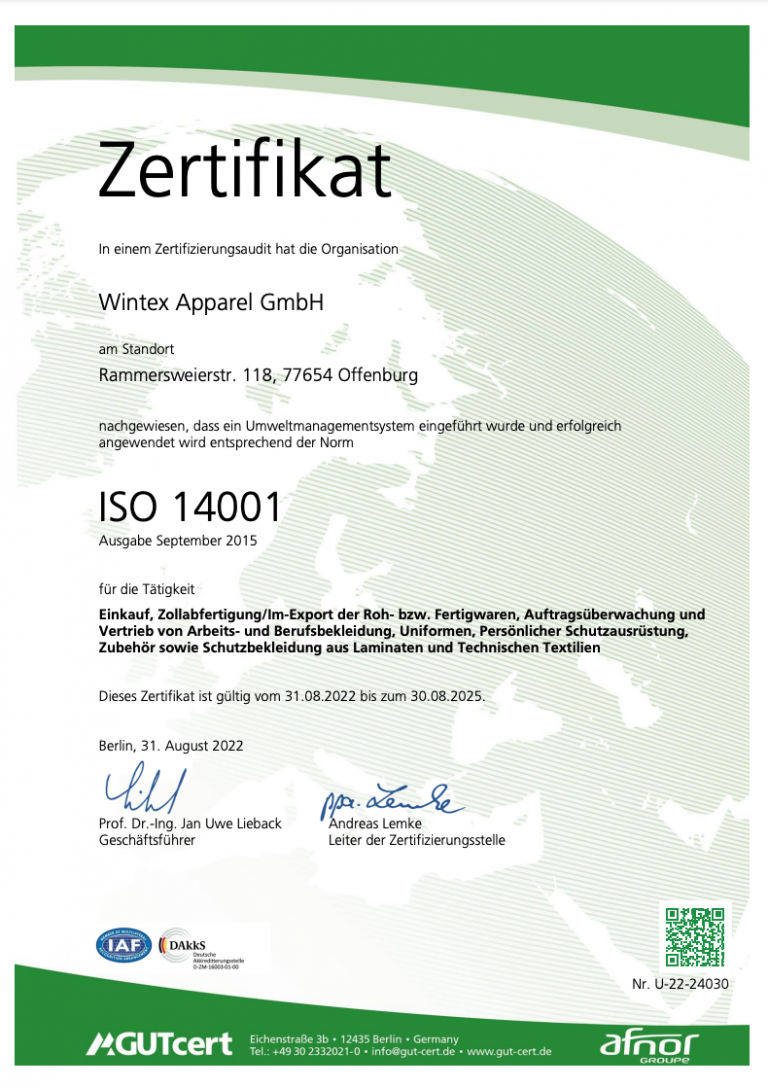 Bei WINTEX Apparel setzen wir unsere stolze Tradition der hochwertigen Schutzkleidung fort. Unsere Geschichte, geprägt von Innovation und Qualitätsbewusstsein, führte uns von einem bescheidenen Anfang in einem heimischen Keller zu unserer schönen Zentrale in Offenburg. ISO-Zertifizierungen bestätigen unser Engagement für Exzellenz, und die ISO 14001:2015 Zertifizierung unterstreicht unsere Nachhaltigkeitsziele.